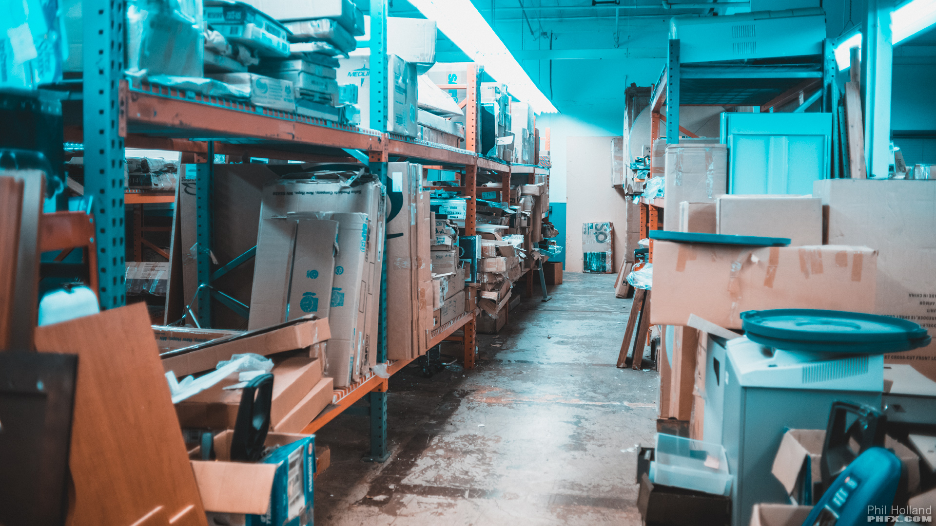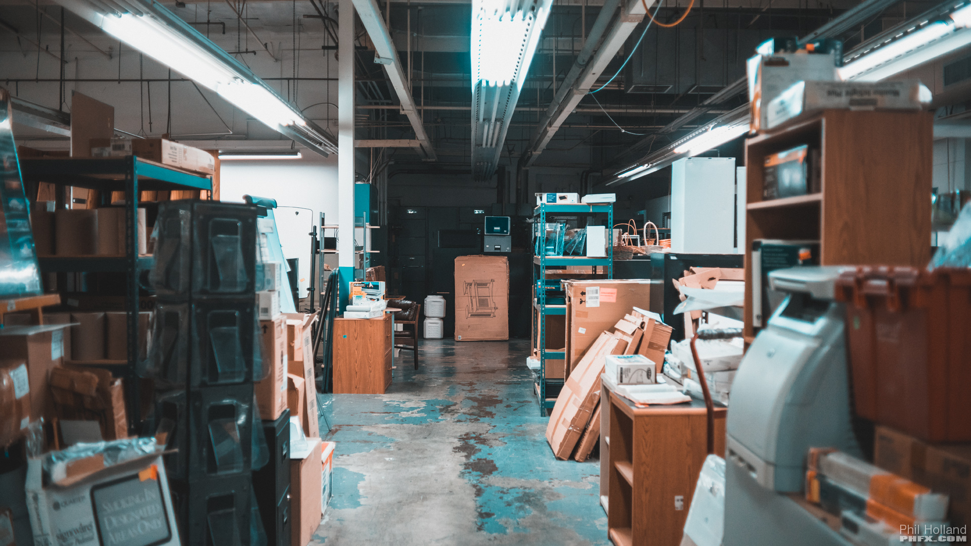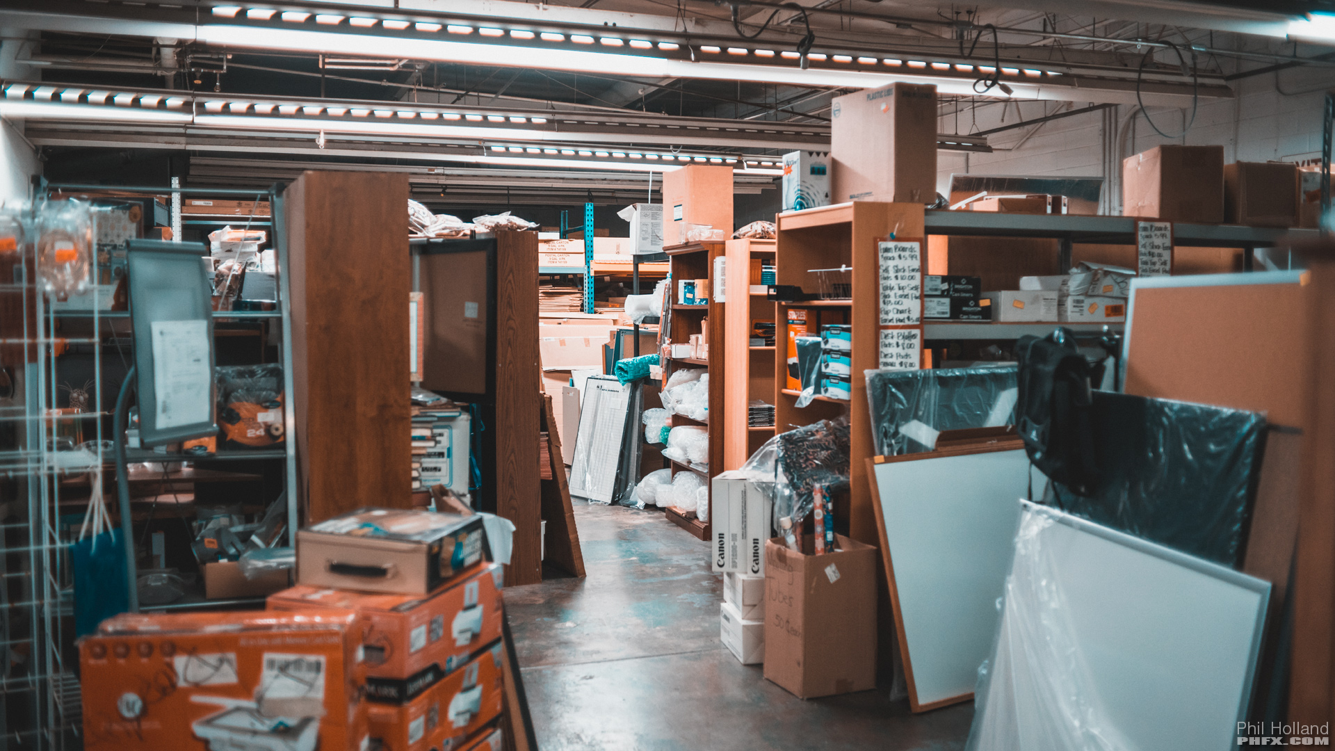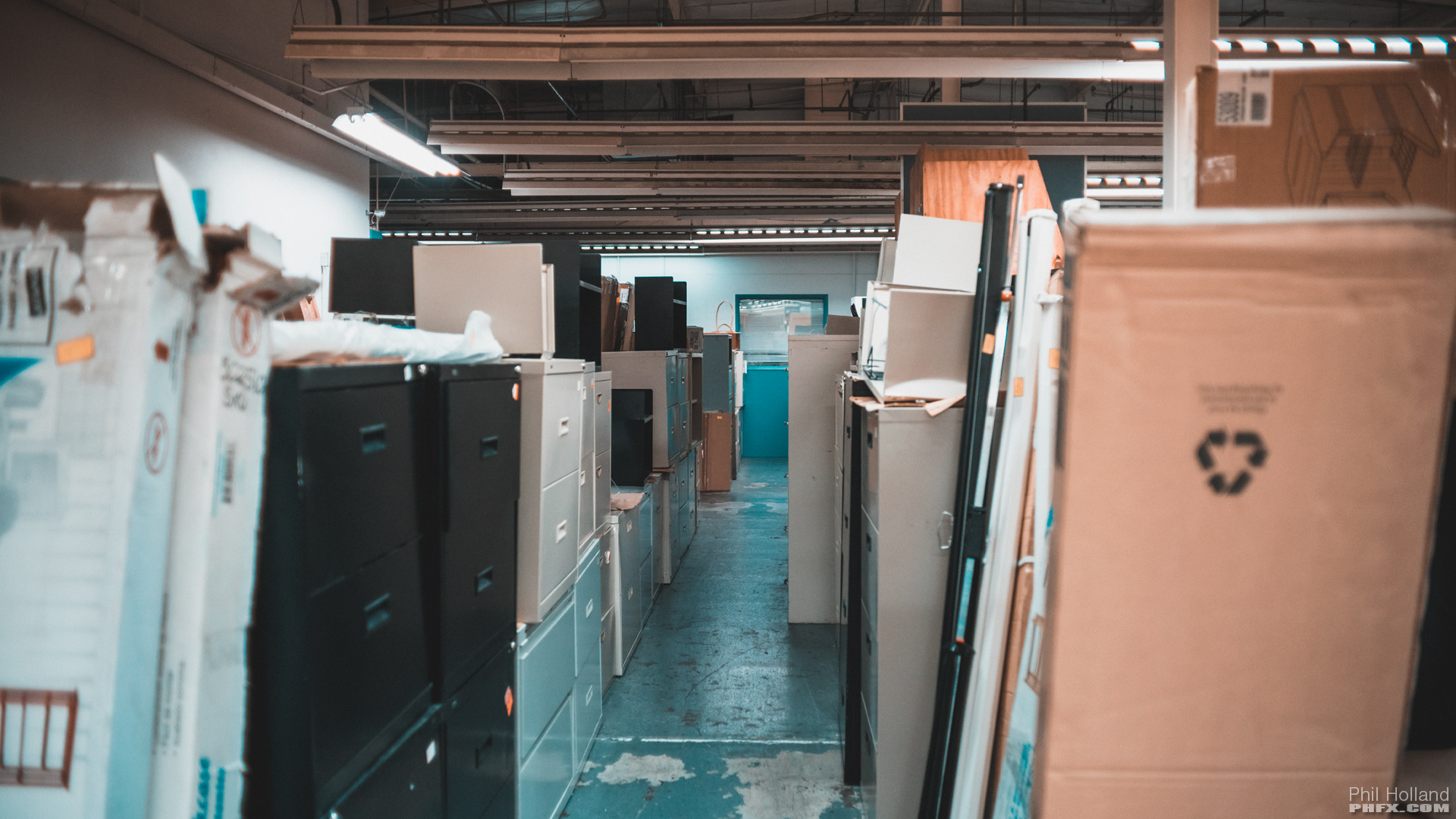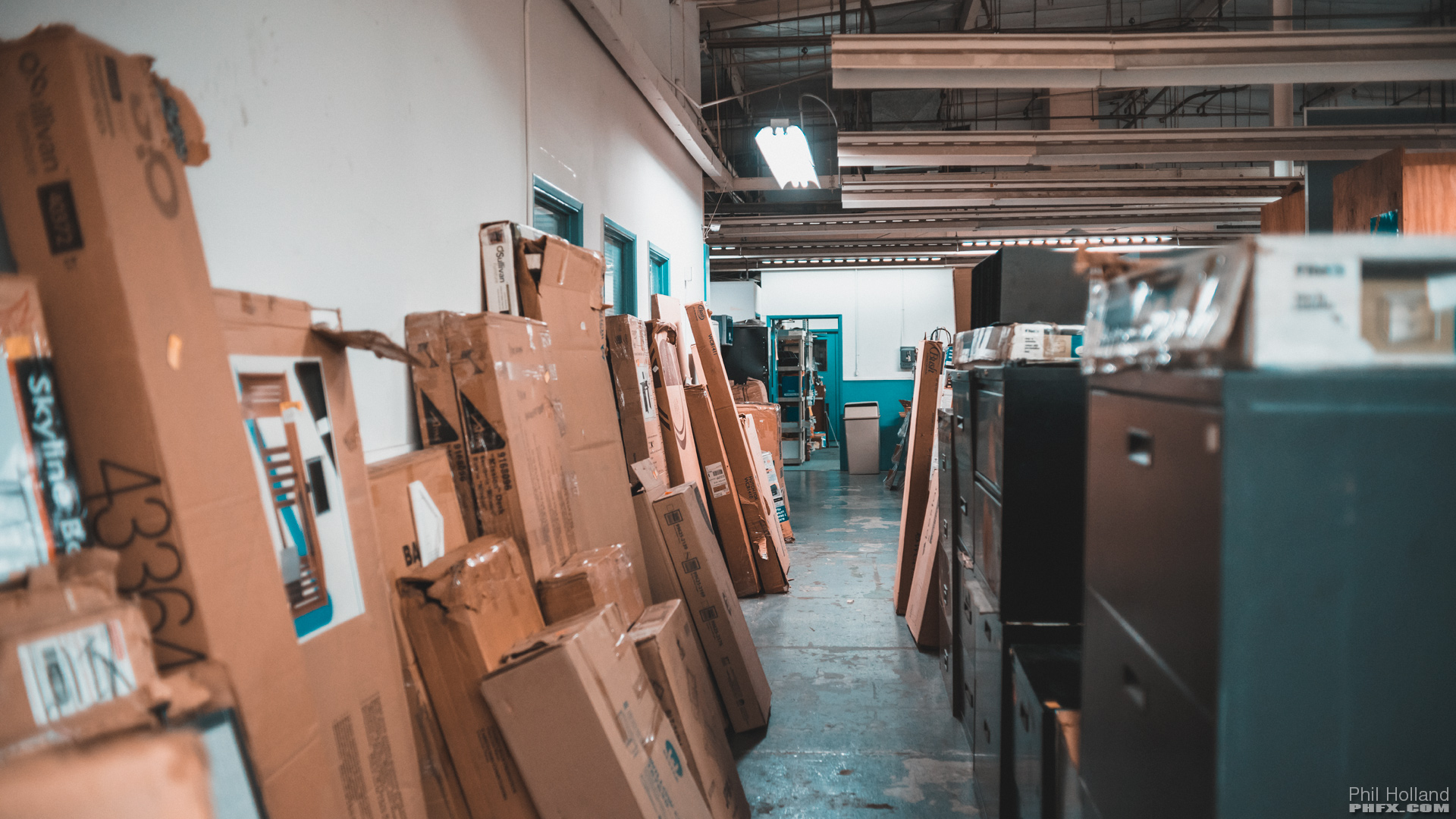 The Interior Warehouse is approximately 10,000 square feet and surrounded by long hallways with overhead flourescent lighting. The Warehouse itself features various corridors and spaces surrounded by Office Equipment, Cardboard Boxes, Industrial Shelving, and Filing Cabinets.