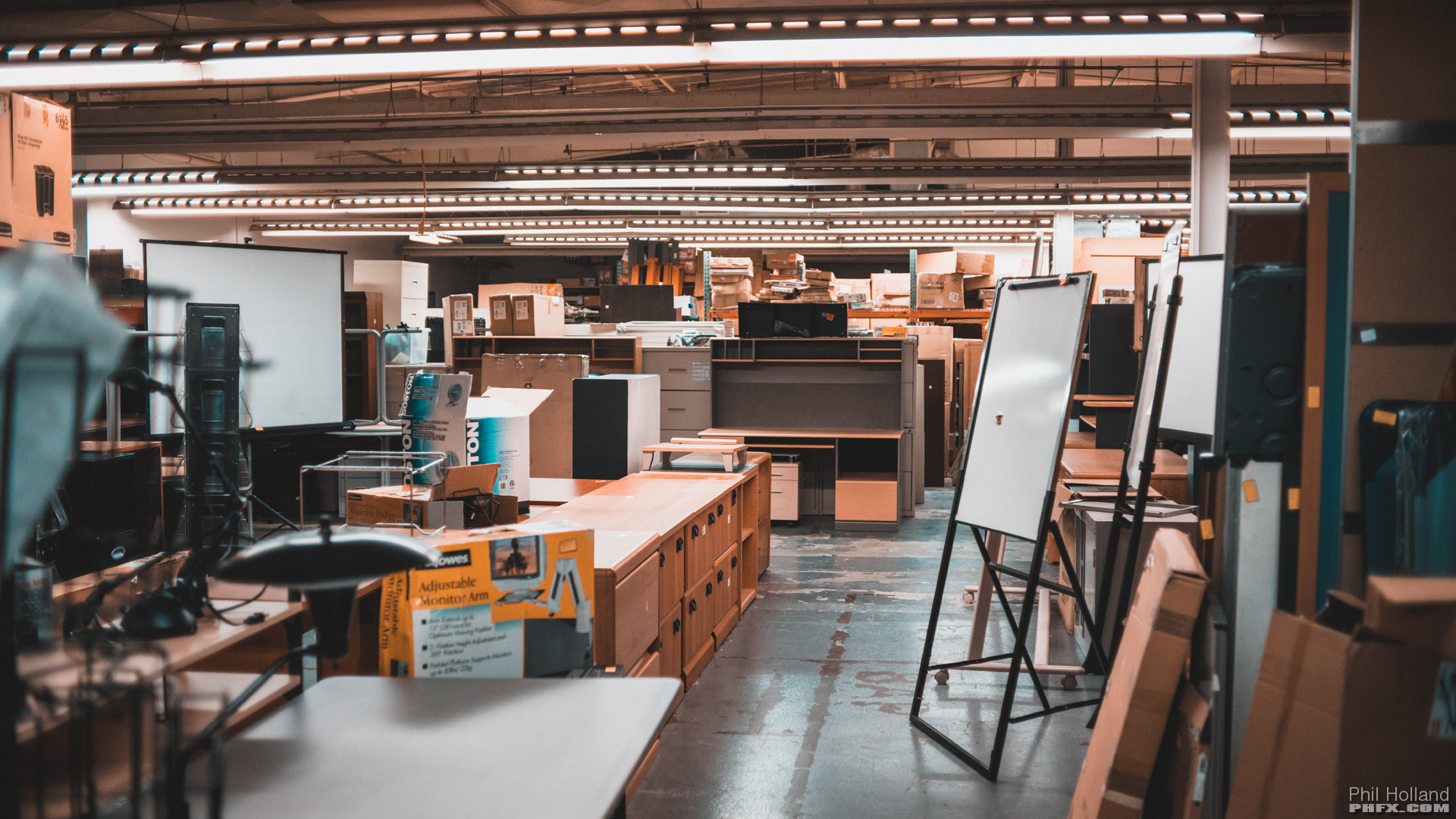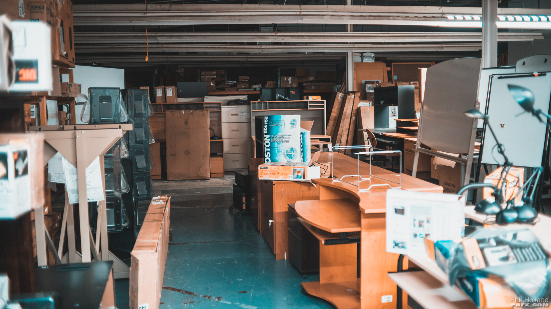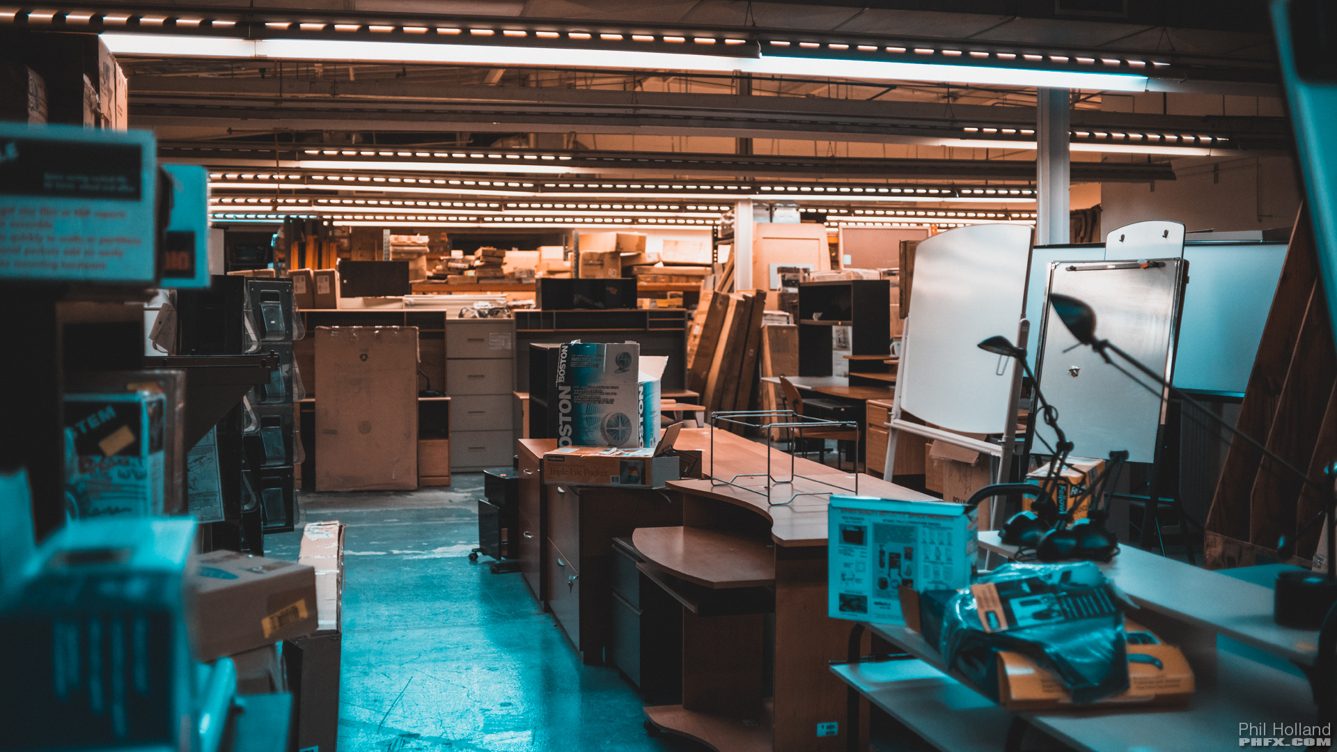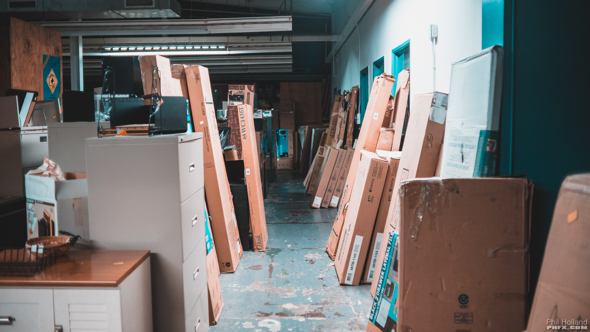 The Interior Warehouse is approximately 10,000 square feet and surrounded by long hallways with overhead flourescent lighting. The Warehouse itself features various corridors and spaces surrounded by Office Equipment, Cardboard Boxes, Industrial Shelving, and Filing Cabinets.