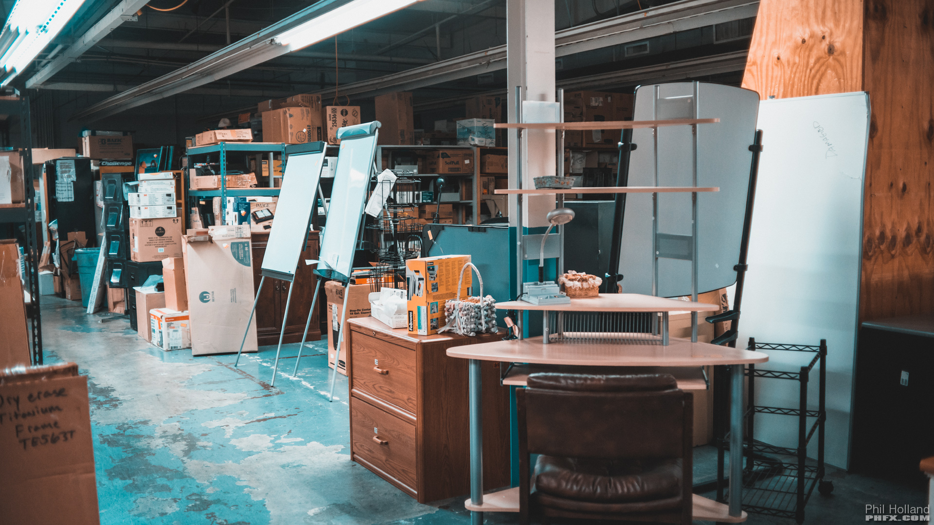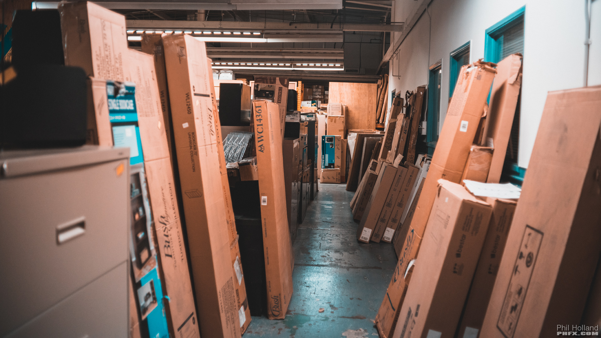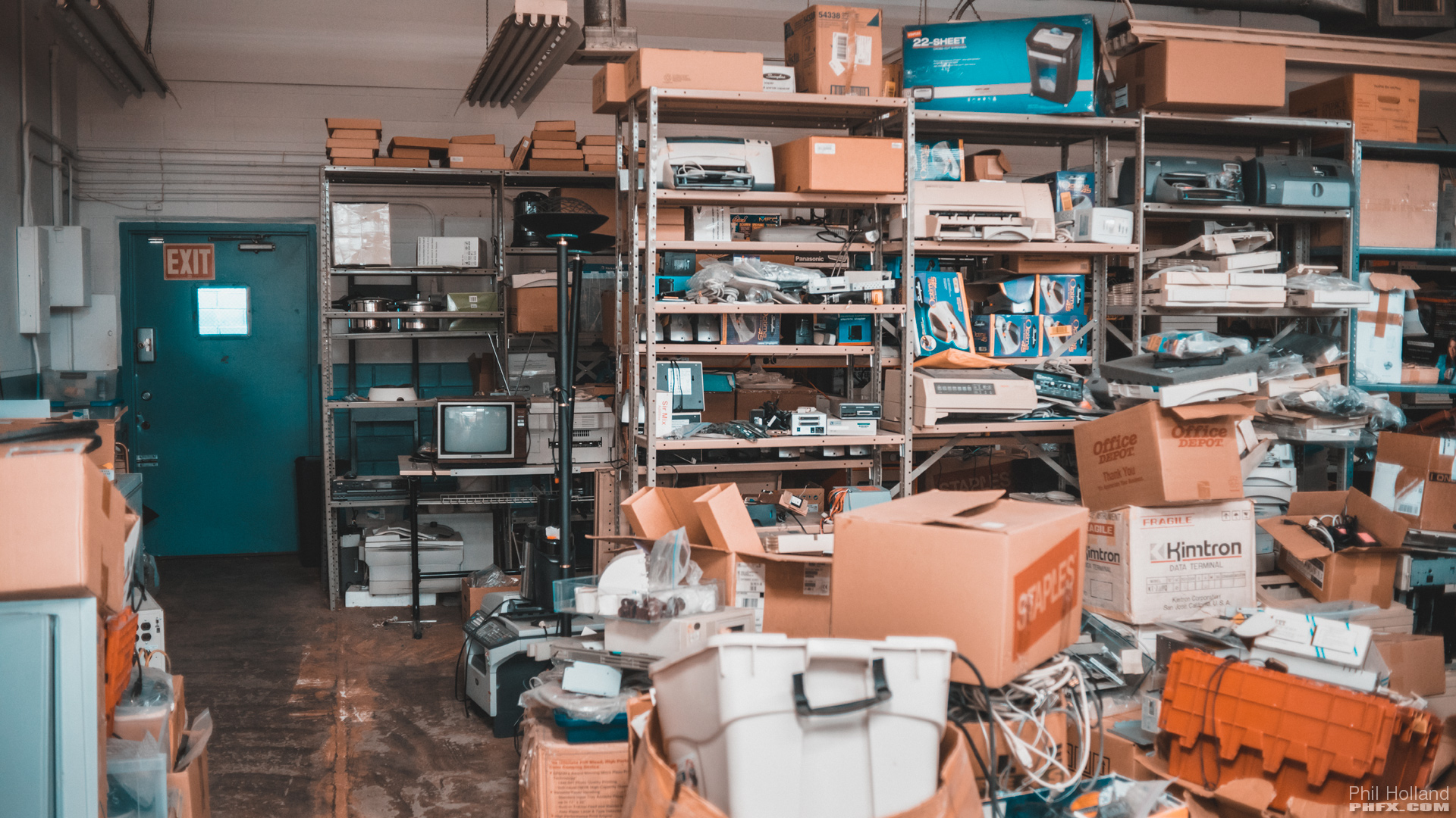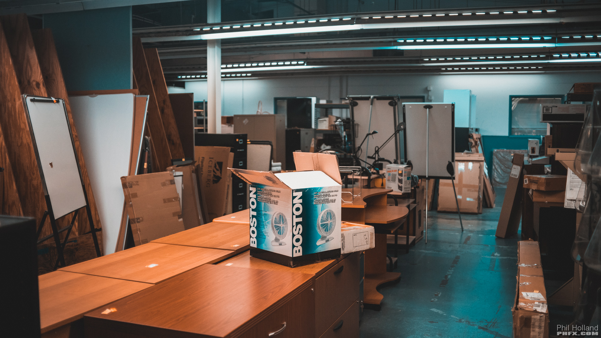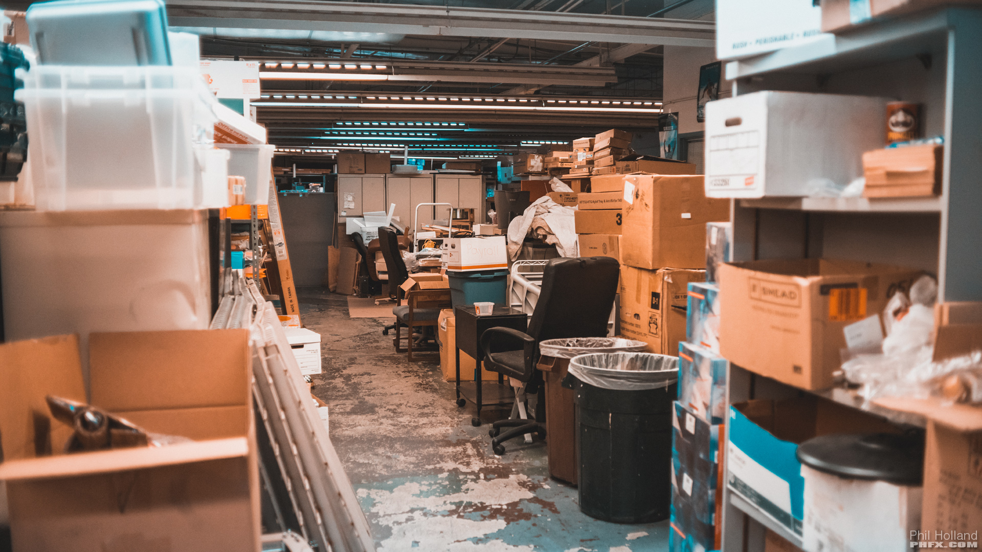 The Interior Warehouse is approximately 10,000 square feet and surrounded by long hallways with overhead flourescent lighting. The Warehouse itself features various corridors and spaces surrounded by Office Equipment, Cardboard Boxes, Industrial Shelving, and Filing Cabinets.
