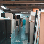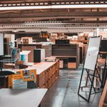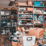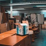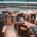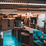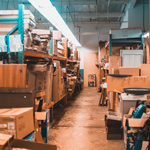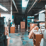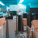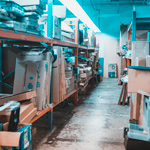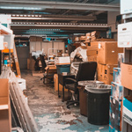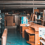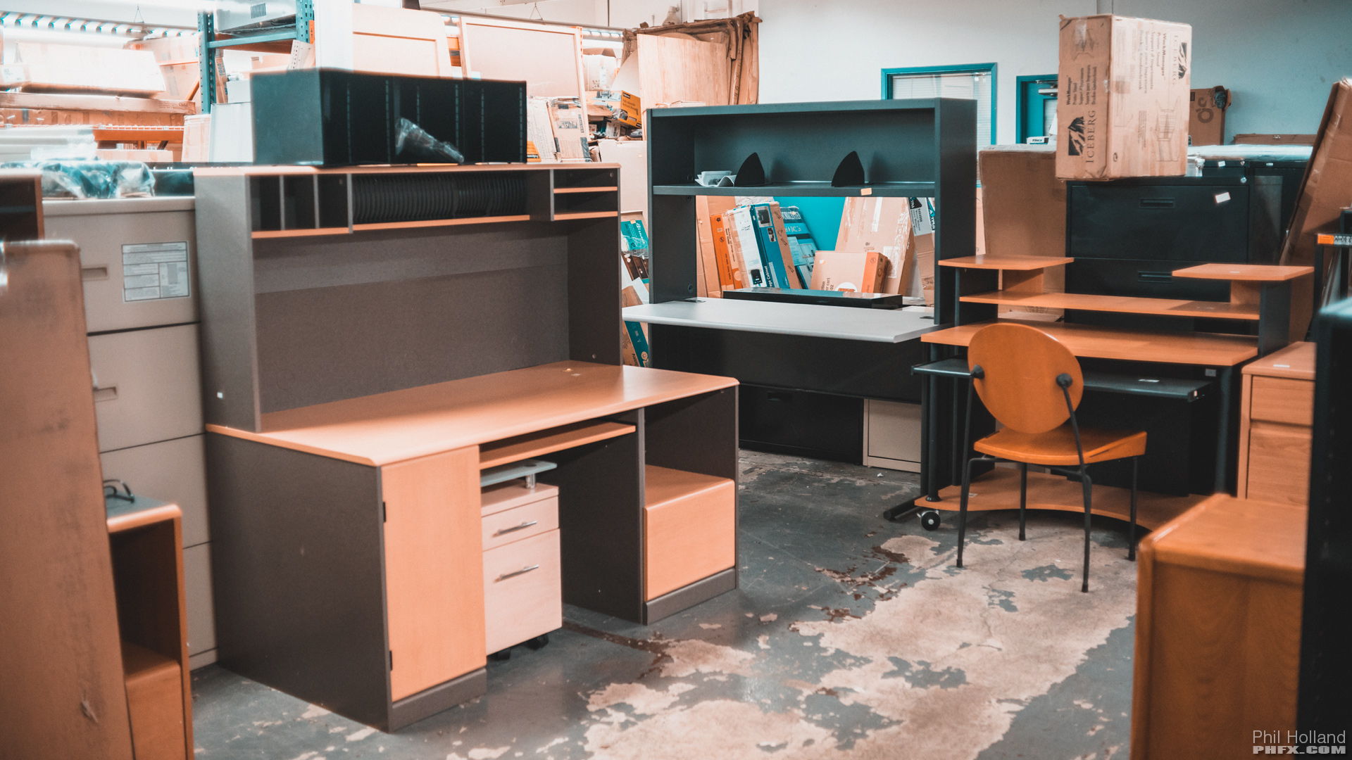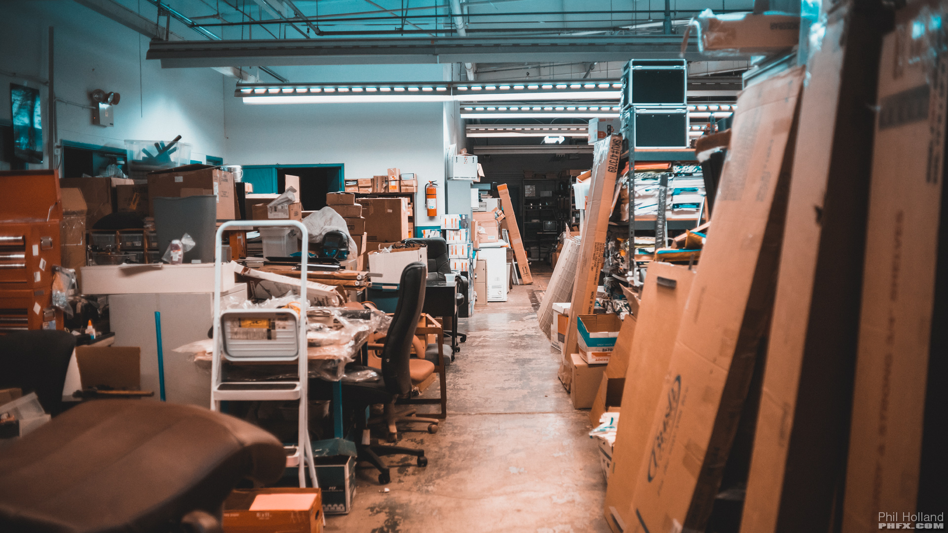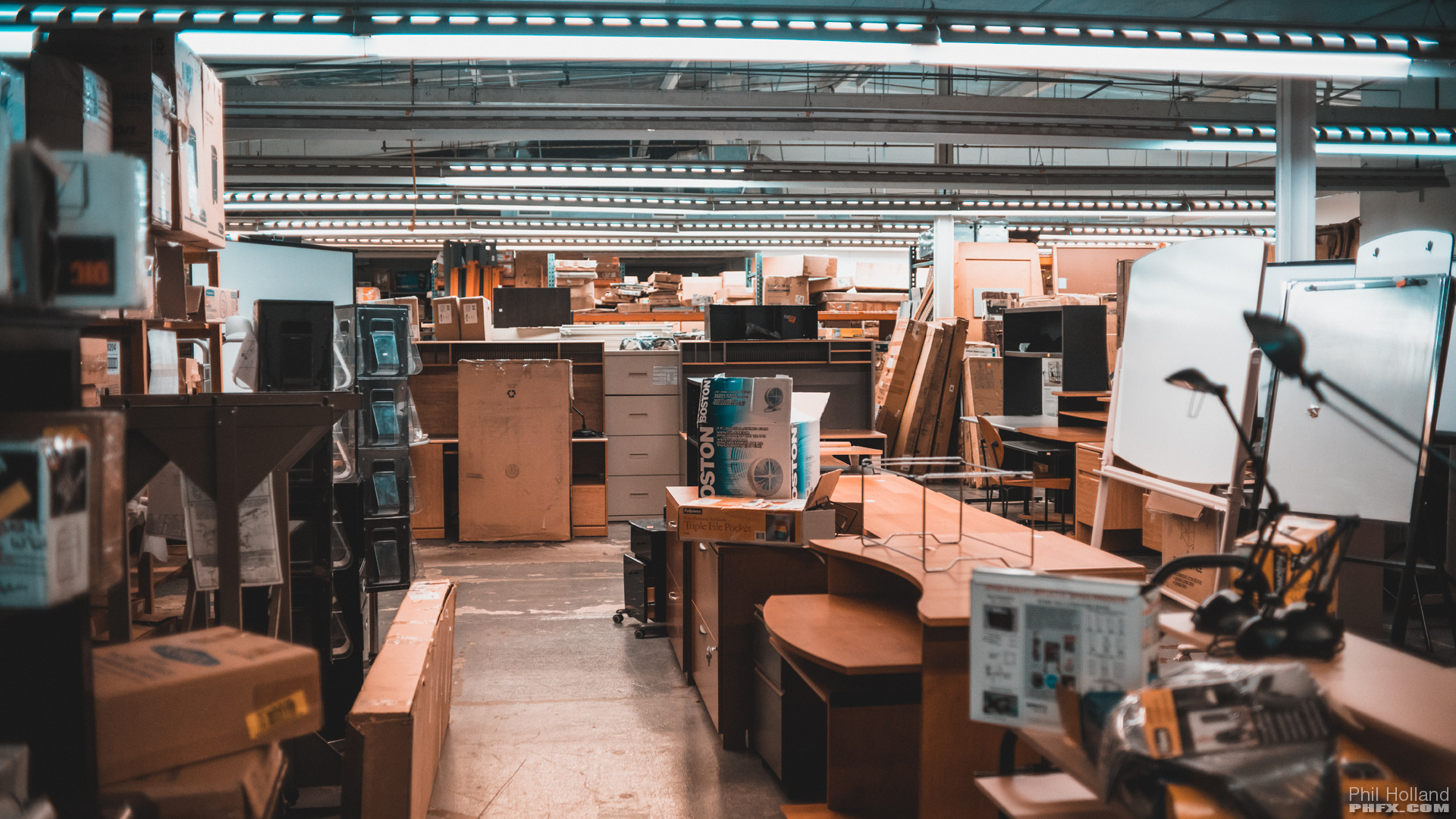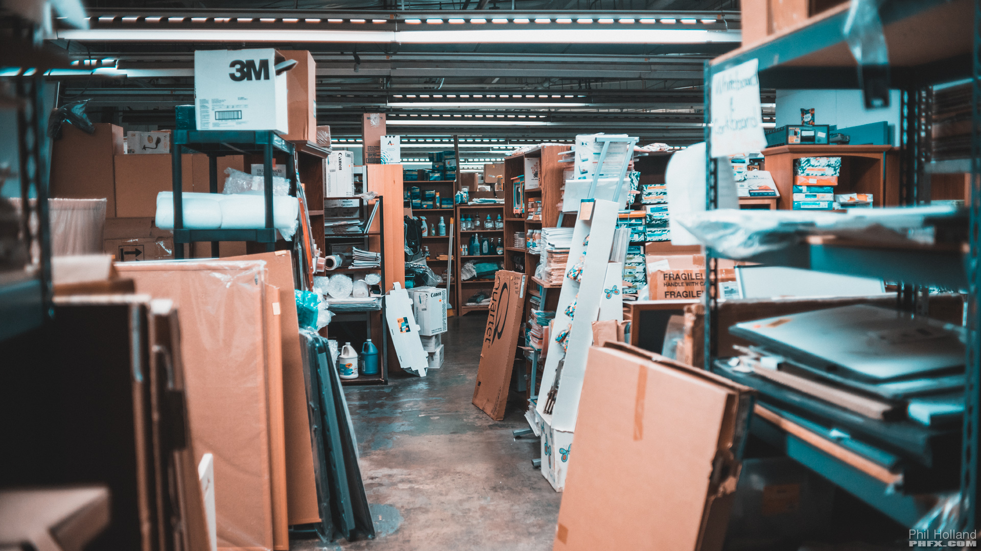 The Interior Warehouse is approximately 10,000 square feet and surrounded by long hallways with overhead flourescent lighting. The Warehouse itself features various corridors and spaces surrounded by Office Equipment, Cardboard Boxes, Industrial Shelving, and Filing Cabinets.